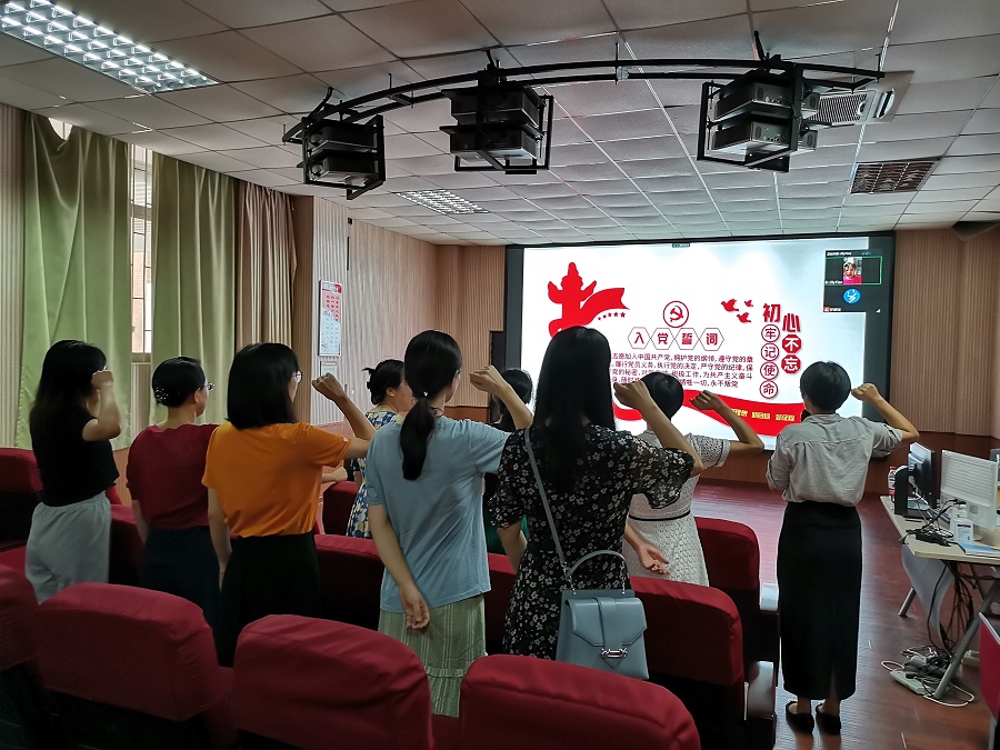 会议伊始,陈春丽带领全体党员重温入党誓词,牢记共产党员的政治责任和历史使命,以更加饱满的热情投身各自工作,切实发挥共产党员的先锋模范作用,永葆共产党员的政治本色。接着,集中学习了习近平总书记在庆祝中国共产党成立 100 周年大会上的讲话金句。习近平总书记的重要讲话,视野宏阔,贯通历史、现实和未来,内涵丰富,博大精深,有许多新的理念、思想、立场、观点,需要我们每一位党员深入学、反复学,用心领会、用情感悟、用力践行。之后,党支部书记黄丽英向全体党员汇报2021年上半年支部的工作情况和开展党史学习教育情况,通报党支部委员会检视问题情况。她强调,高校承担着实现教育现代化的重要任务,同时又是培养国家重要人才的主阵地,每位教工党员都身兼为党育人、为国育才的重要使命。她要求,每位教工党员都需密切关注员工心态变化,注意培养员工爱国情怀,并把课程思政融入日常教学中去,与专业相结合,不断创新课程思政表达形式。最后,支部党员逐一发言,自觉检视自身党史学习进度和为身边群众办实事落实情况,对自身存在问题进行反思并提出解决方案。大家纷纷表示,自觉做到学党史、知党恩、听党话、跟党走,牢记职责、立足岗位,在教学工作中,探索课程思政教学改革,致力于传播先进思想,引导员工健康成长。