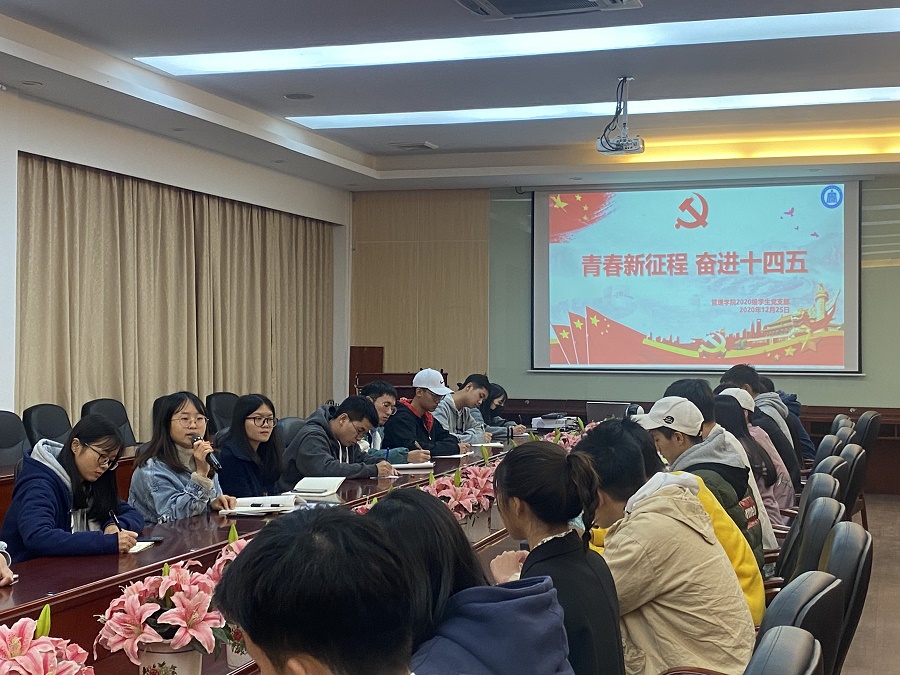 会议以学习党的“十四五”规划报告原文、总结心得体会等方式深入学习了“十四五”规划精神。柯陈洁在会议上指出,“十四五”时期,我国面临全面建成小康社会、开启全面建设社会主义现代化国家的新征程,可谓任务艰巨、责任重大,今年是我国决战脱贫攻坚战收官之年和“十三五”规划收官之年,作为入党积极分子要把党的宗旨牢记于心,始终坚守为人民服务的初心。随后廖妙、黄威棱、郑丹茹同学分享了关于学习“十四五”规划的心得体会。同学们纷纷表示,“十四五”规划是我国在全面建成小康社会基础上开启全面建设社会主义现代化国家新征程的第一个五年规划,意义重大,青年一代作为重要的参与者也应发挥自己的力量为“十四五”蓝图添上一抹色彩。