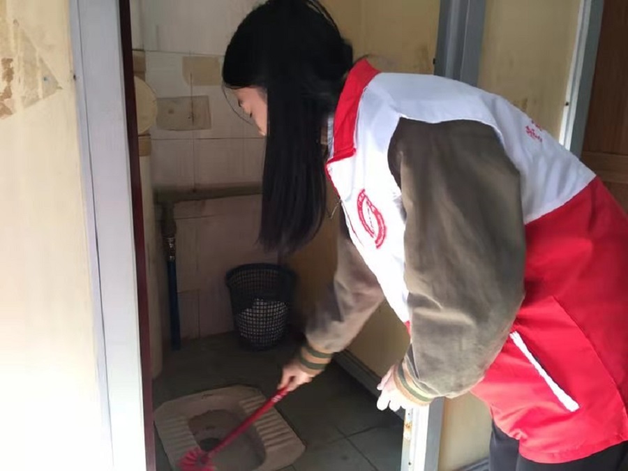党员正在认真清洁厕所卫生