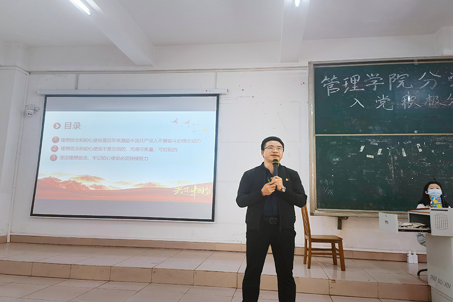 随后,汪椿东以“坚定理想信念 牢记初心使命”为主题,从坚定理想信念与初心使命的意义、衡量和检验的标准以及如何坚定理想信念牢记初心使命三方面进行讲述。强调了理想信念是共产党人的精神支柱和政治灵魂,初心使命是党的性质宗旨、理想信念、奋斗目标的集中体现。党员干部务必要对党忠诚,始终把人民放在心中最高位置,做到关键时刻经得起考验,正确处理好小我和大我的关系。指出新时代的新青年们一是要深入学习理论,要把学懂弄通做实习近平新时代中国特色社会主义思想作为首要政治任务,要多读原著、勤学原文、深悟原理;二是要传承红色基因,向先辈先烈先进学习,重温老一辈革命家和英烈的家国情怀,通过听党课、听报告、学习相关红色知识等方式提高自身的知识素养;三是要竭诚为民服务,为同学服务,加强专业知识和专业能力训练,补上知识弱项、能力短板,切实的了解身边同学的困难,主动帮助;四是要勇于担当作为,要发扬斗争精神,在原则问题上不当软骨头,踏实做好本职工作,勇于承担班级与公司工作,坚持干字当头、苦干实干;五是要加强自我修炼,积极参加各项活动,做到经常自检,自我反省,强化道德修养,不断提高政治觉悟和政治能力。