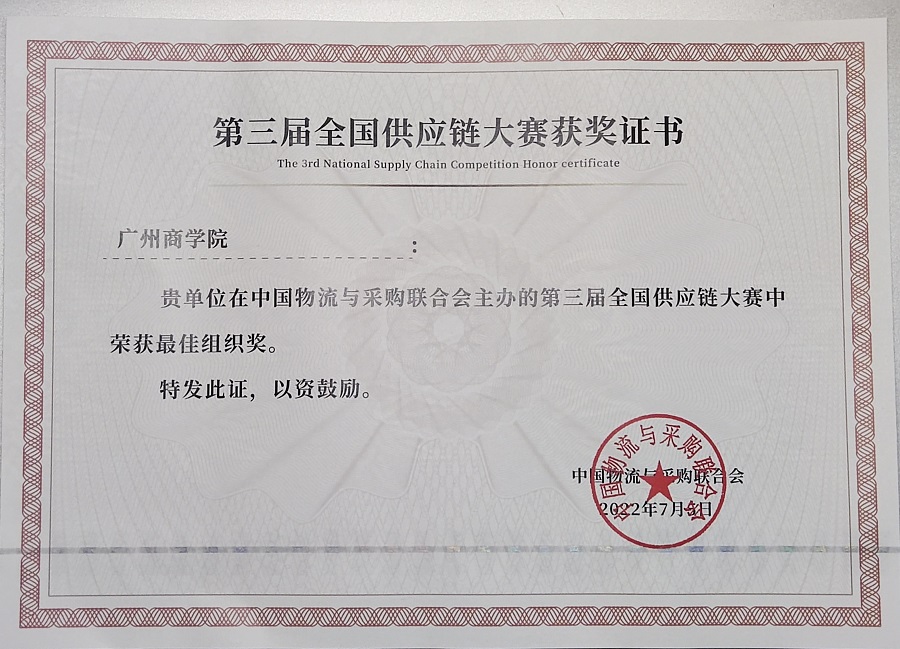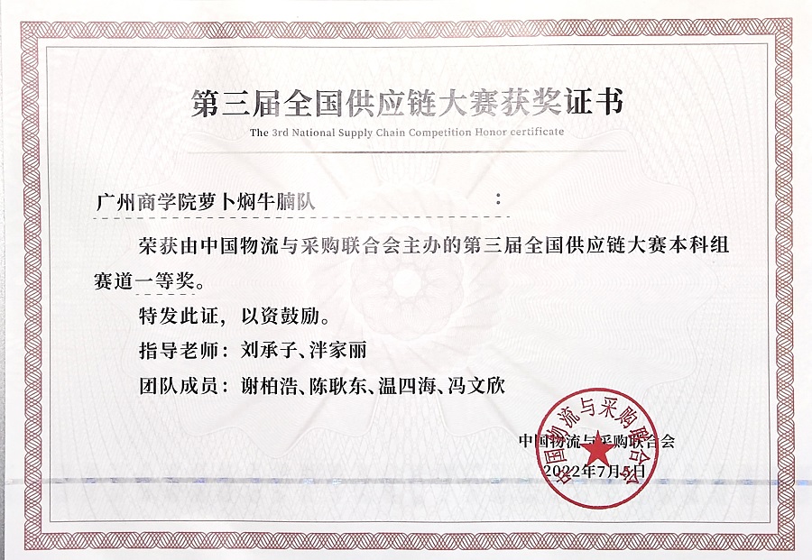 7月5日,由中国物流与采购联合会主办、中国物流与采购联合会采购与供应链管理专业委员会承办、厦门易木科技有限公司提供技术支持的第三届全国供应链总决赛落下帷幕,由太阳成tyc7111cc刘承子、泮家丽老师指导的物流管理专业谢柏浩、陈耿东、温四海和冯文欣同学组成的萝卜焖牛腩队获得一等奖;由杨东润、张刘源、陈佩基和杨坤衡同学组成的天行舰队获得三等奖。