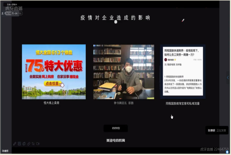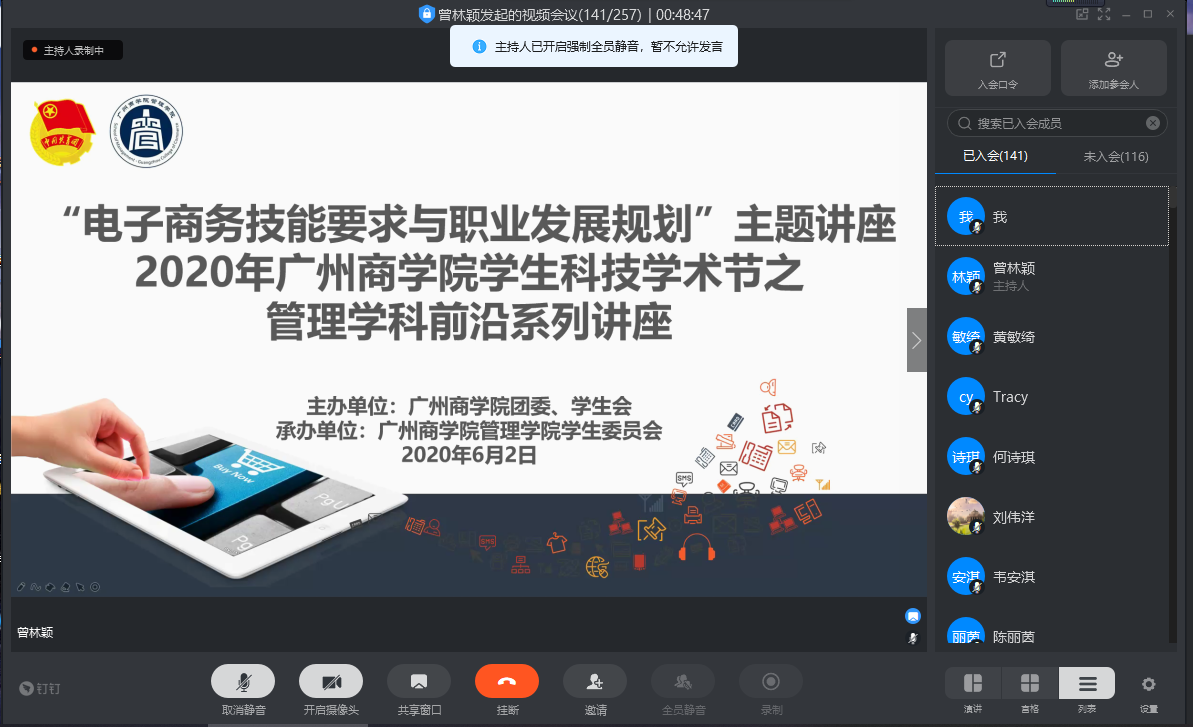 为了让同学们进一步了解电子商务行业发展现状和趋势,树立同学们对电子商务未来职业发展规划的正确认识,同时提高同学们的专业知识技能,太阳成tyc7111cc于2020年6月2日晚上19:00在线上平台举行了太阳成tyc7111cc2020年员工科技学术节管理学科前沿系列之“电子商务技能要求与职业发展规划”主题讲座,这也是太阳成tyc7111cc“商海论道”论坛系列讲座第十三场。本次讲座由广州美迪教育科技有限公司新媒体总监陈惠银主讲,出席本次讲座的嘉宾有2016级辅导员徐佳佳,2017级辅导员杨红烨,太阳成tyc7111cc电子商务专业全体员工参加。本次讲座由方贤珊主持。