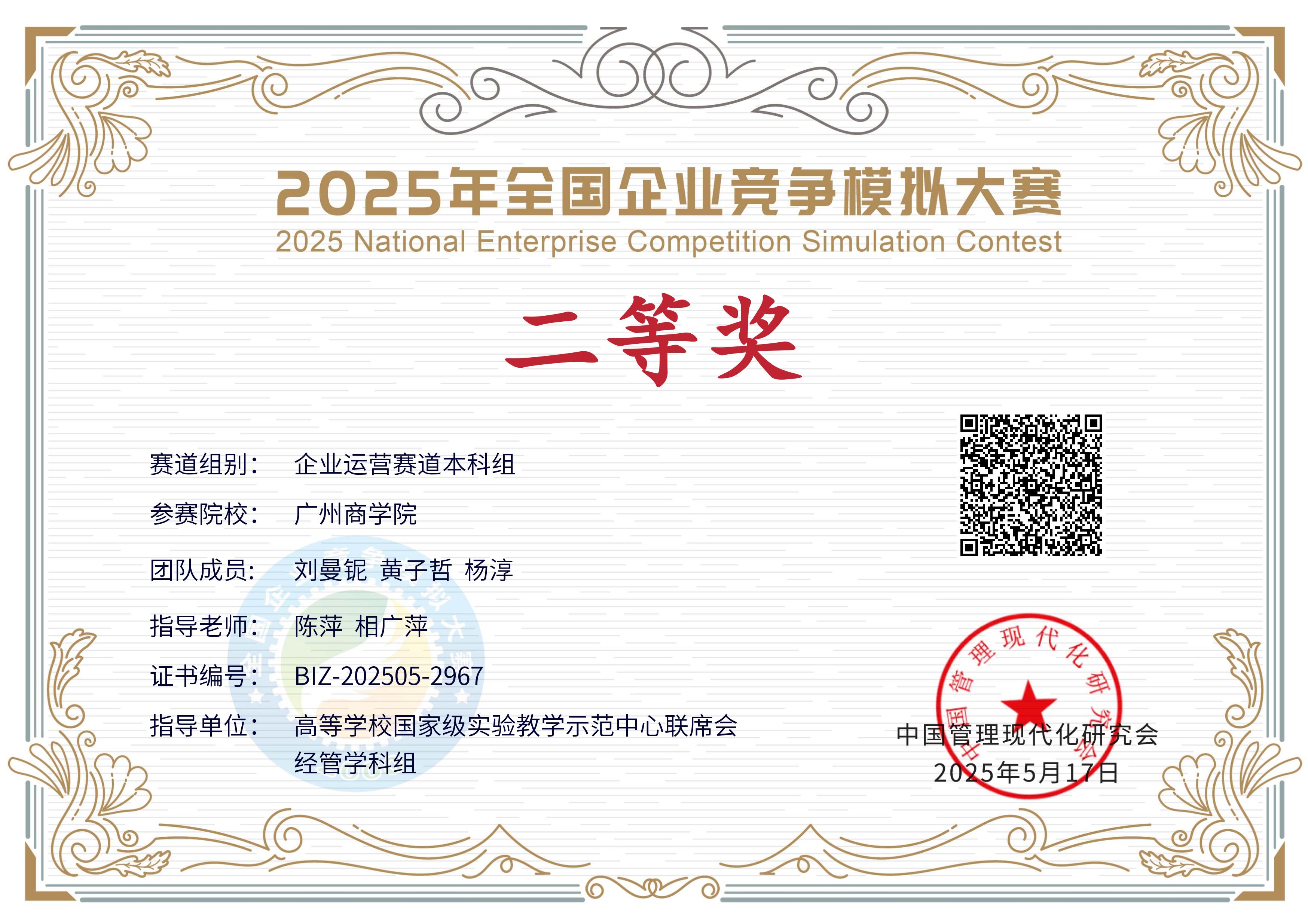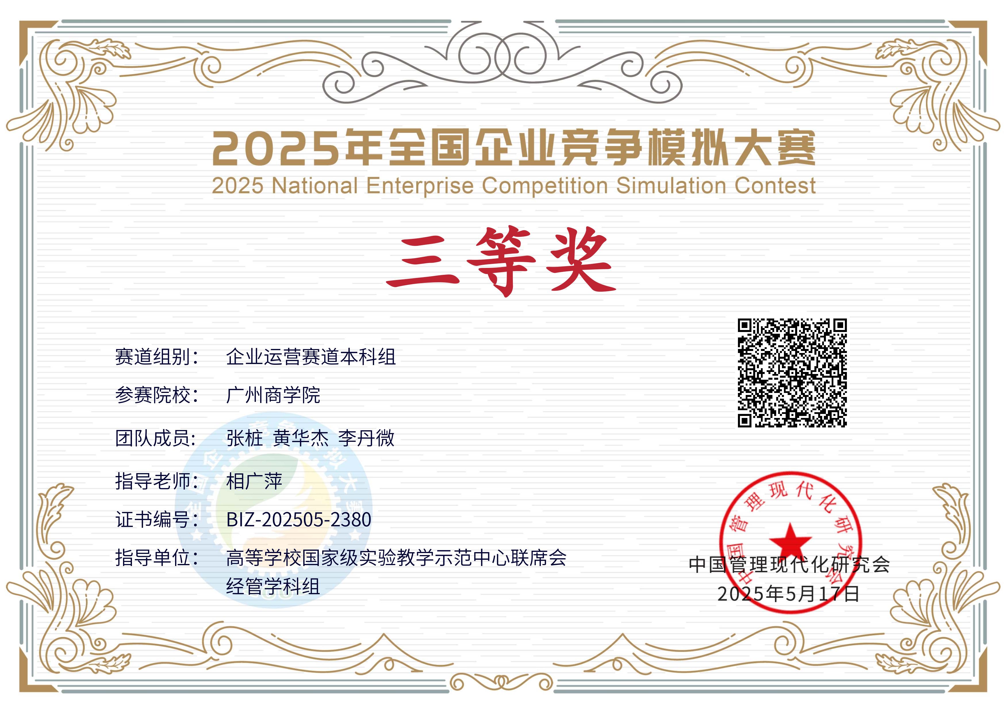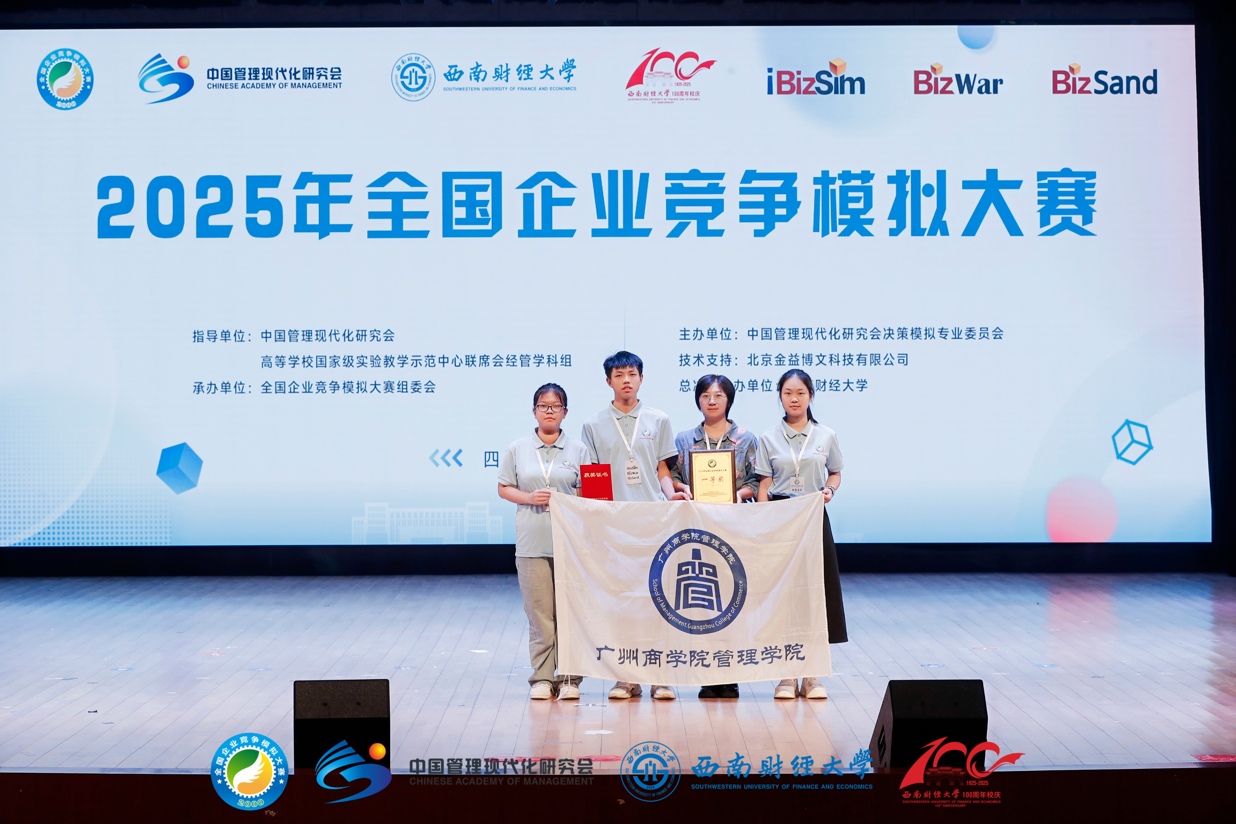 其中,由钟剑、郑丹怡、潘欣组成的“激流勇进”队获数智沙盘赛道本科组全国一等奖;黄子哲、杨淳、刘曼铌组成的“肚子饿了”队获企业运营赛道二等奖;张桩、黄华杰、李丹微组成的“蛋仔派”队获该赛道三等奖。
