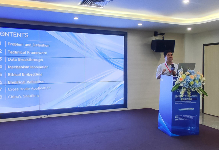 会议议程丰富,包含主旨演讲、特邀报告、口头报告及成果展示等环节。与会专家学者围绕环境智能治理、人工智能技术应用、工程管理创新等核心领域,分享了最新研究成果与前瞻洞见。胡祖武教授作为特邀报告嘉宾,发表了题为“环境智能治理的三元悖论突破:数据驱动、机制设计与伦理嵌入的协同演进”的学术报告,其独到见解引发与会专家学者的高度关注与热烈讨论,并获得奖励证书。