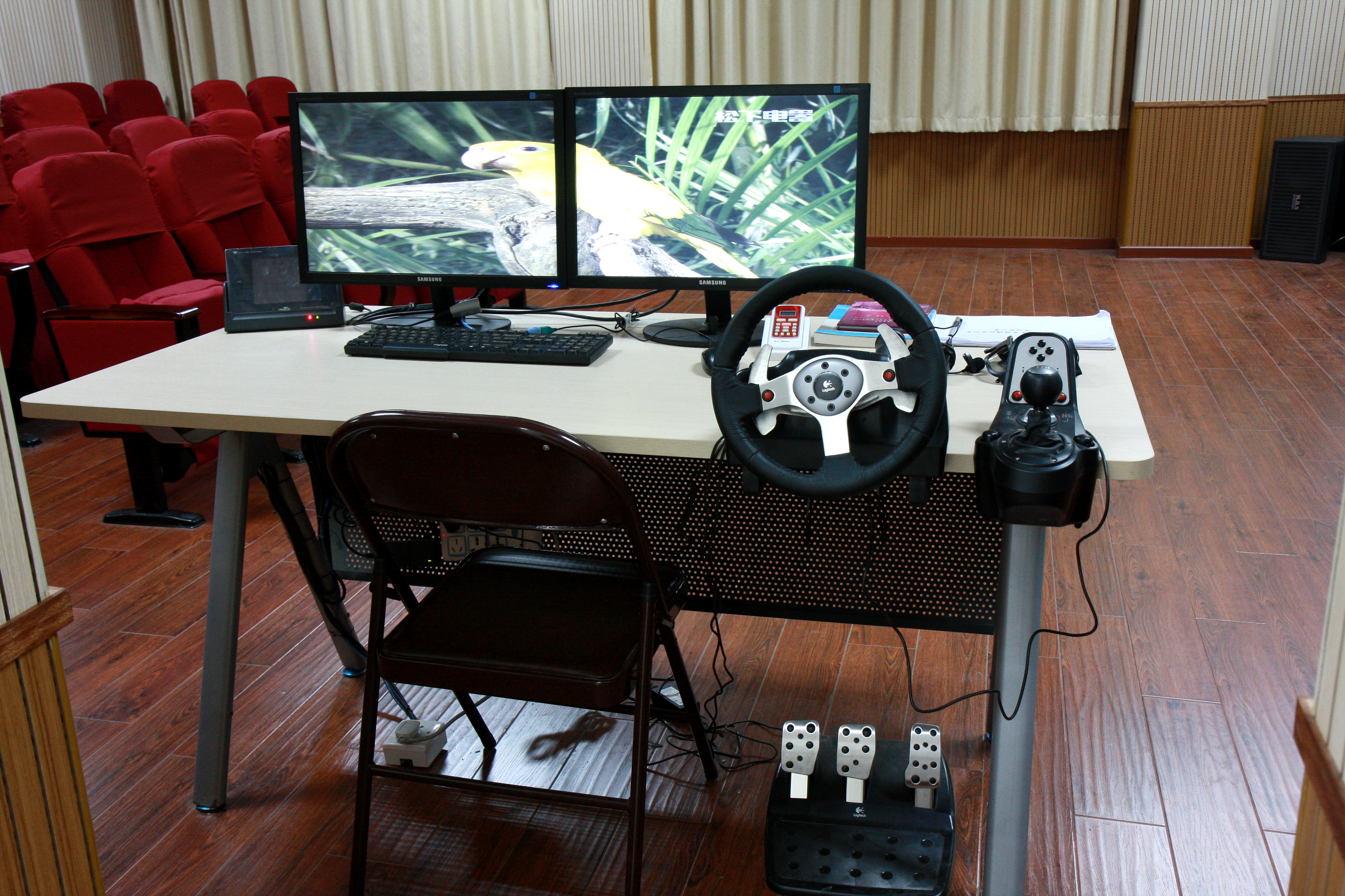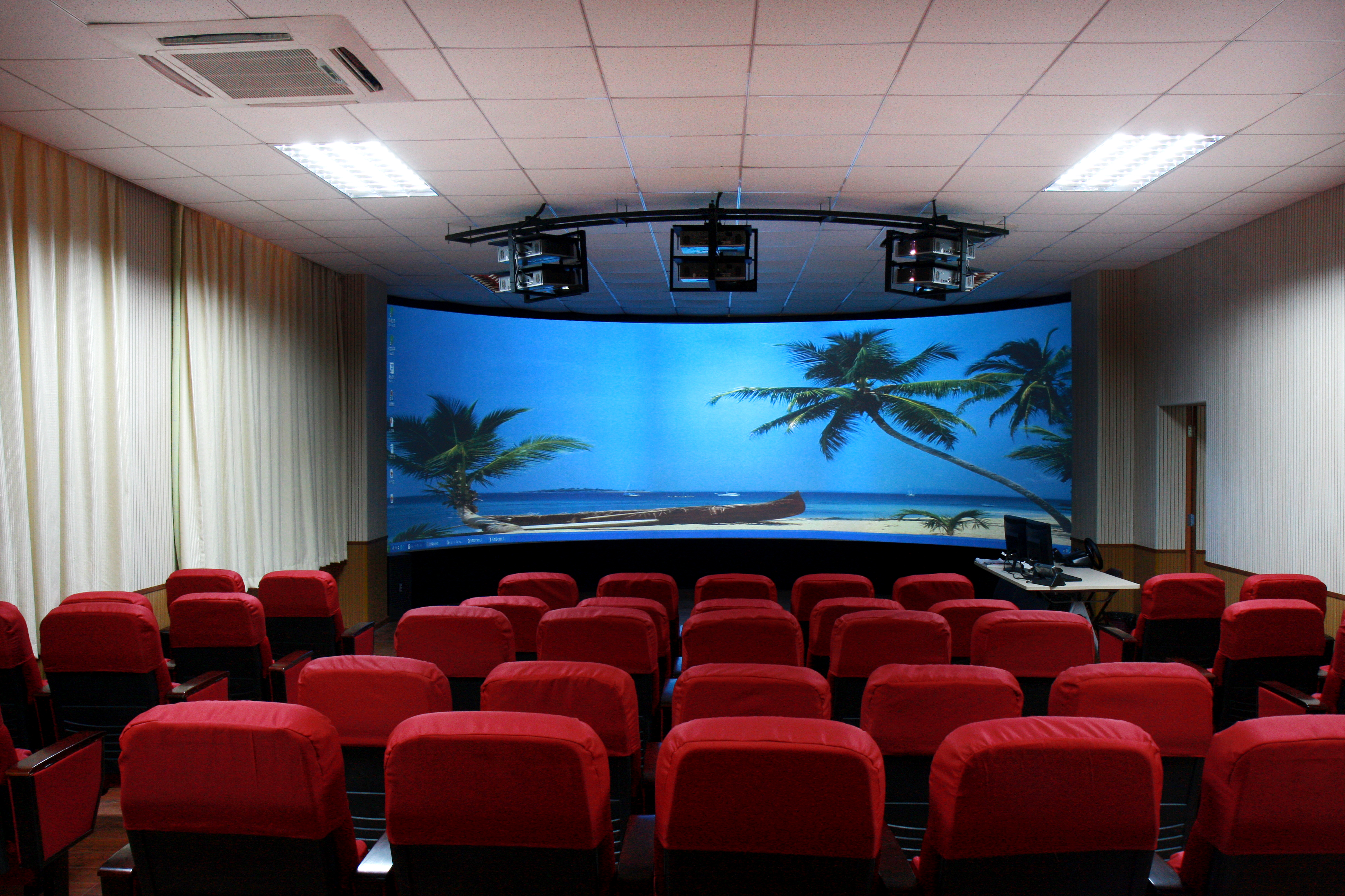 该实训室安装有专业投影机、专业金属投影屏幕、高性能专业图形工作站、三通道立体数字图象融合机、视频矩阵切换器、LCD显示器、多屏宝、专业投影机吊架及配件、专业偏振玻璃镜头、专业立体眼镜、方向盘、5.1声道环绕立体声音响、专业调音台、多媒体中控台、立体投影模块、游戏外设模块、三维虚拟旅游平台、三维虚拟旅游平台景点课件、三维互动仿真平台软件,安装软件有:导游实训教学软件、国家导游基础考试系统、酒店模拟导游软件。设备投入约50万元。