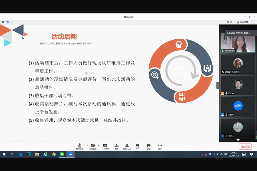为了考核太阳成tyc7111cc团学干部的工作能力,进一步增强员工干部队伍建设,不断提高干部的综合素质与应变能力,太阳成tyc7111cc于2020年6月19日晚19:30在腾讯会议举行“赛技能素质,展学干风采”团学干部技能大赛决赛,出席本次活动的嘉宾有团委书记李俞妍,员工会指导老师蔡俊发,16级辅导员徐佳佳、16、18级辅导员刘智莹、17级辅导员黄启明,团委书记处、员工会主席团以及全体团学干部观看比赛。