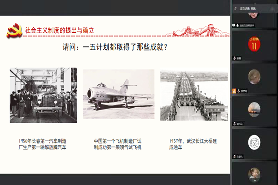 “党史云课堂”在激昂奋进的团歌中拉开帷幕,课上,预备党员黄楚瑶对新民主主义革命时期的相关内容进行了领学,集中回顾了1919年至1949年新民主主义革命时期中国共产党的光辉历史,重温了五四运动、一大建党、南昌起义、红军长征、联合抗战、解放全中国等重大事件及其重要意义;入党积极分子雷茜生动介绍了中共八大以来,党对社会主义建设道路的探索,在每个时期党所面临的挑战和问题,展现了党面对艰难险阻做出的反思与调整。会上团支书赵棚对支部在本学期的思想引领、主题团日、社会实践、学风建设、文体氛围、感情建设等进行分析,总结了支部的特色之处,对未来一个学期的团支部工作进行了目标规划,争取让支部的团生活更加创新,更加丰富多彩。