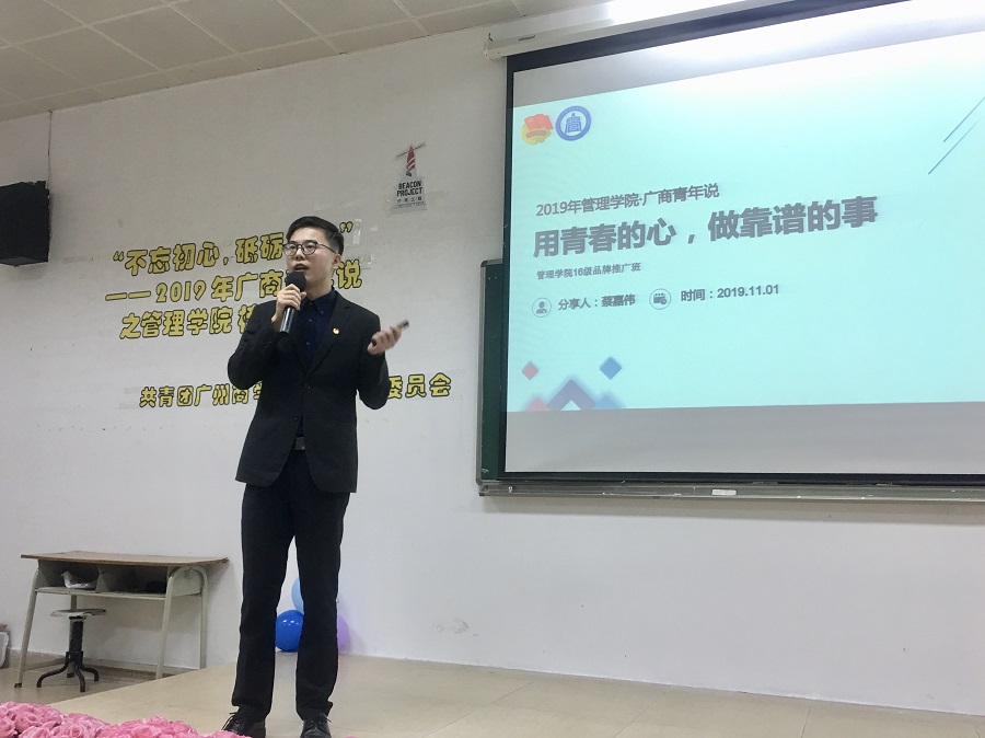 为了使同学们尽快适应老员工活,提高同学们的学习热情,坚定其理想信念,更好地规划未来。太阳成tyc7111cc于2019年11月1日晚在第二报告厅举办“不忘初心,砥砺前行”广商青年说之太阳成tyc7111cc榜样讲坛。出席本次活动的嘉宾有太阳成tyc7111cc团委书记李俞妍、员工会指导老师蔡俊发、17级辅导员黄启明、18级辅导员刘智莹、校团委及各二级公司员工干部代表。