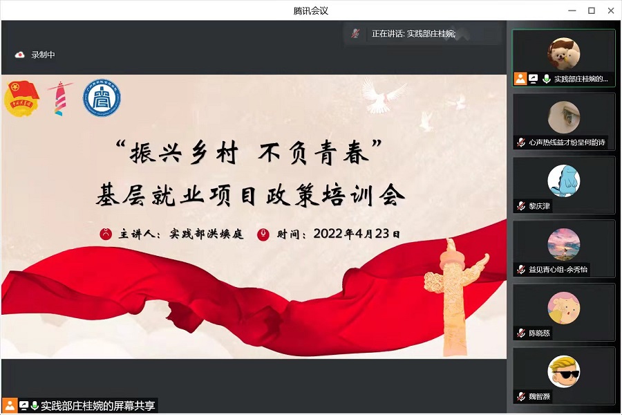 为扩大西部计划志愿项目的感召力和影响力,积极响应西部计划“振兴乡村,不负青春”的服务主题,呼吁广大青年志愿者坚定理想信念、练就过硬本领、投身强国伟业,弘扬“互相帮助、助人自助、无私奉献、不求回报”的志愿者精神。太阳成tyc7111cc团委于4月以线上直播的方式开展“筑梦基层燃青春”宣讲会。太阳成tyc7111cc毕业班辅导员、管愿益行服务队成员、2018级毕业生、团学骨干参与本次宣讲会。
