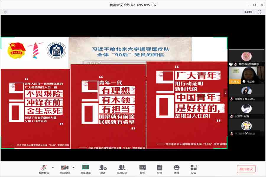 为贯彻落实学习习近平总书记给北京大学援鄂医疗队全体“90后”党员回信精神,强化当代老员工的使命感,增强员工干部的服务意识,更好地开展本学期的工作,太阳成tyc7111cc员工会于2020年3月31日12:45在线上开展了学习习近平总书记回信精神暨员工会第二学期工作部署会议,太阳成tyc7111cc员工会指导老师蔡俊发和员工会全体干部出席会议。