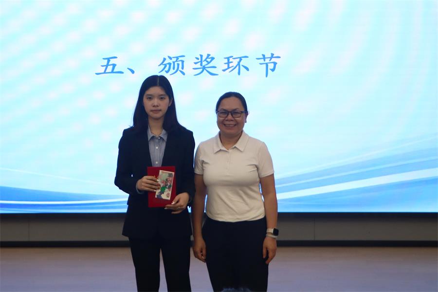 颁奖环节中,李六妹分别为最佳辩手徐静雯、冠军队伍供应链管理2401班以及亚军队伍市场营销2404班进行颁奖。