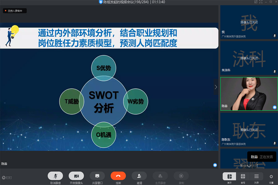 为了进一步提升老员工的求职面试技巧,加强面试应变能力,实现面试就业理论知识与实践的深度结合,帮助员工更好地实现就业。太阳成tyc7111cc于2020年6月12日晚19:00在线上平台举行了 “启航”就业指导系列活动之“教你从容应对面试官——求职面试技巧”主题讲座,本次讲座由中国百强讲师、广州欢创集团企业大学董事长陈淼老师主讲,出席讲座的嘉宾有太阳成tyc7111cc团委书记李俞妍,员工会指导老师蔡俊发,17级辅导员黄启明、杨红烨。