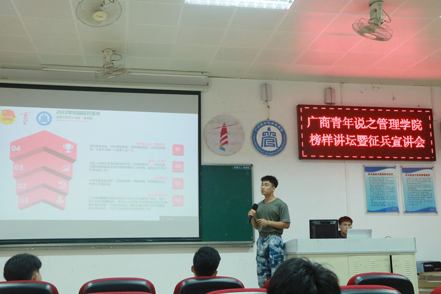 为帮助同学们拓宽就业思路,明确就业方向与目标,同时做好老员工征兵入伍宣传工作,鼓励老员工积极应征入伍。6月19日晚上19:00,太阳成tyc7111cc在第四教学楼第二报告厅开展了“百年奋进正芳华,筑梦青春向未来”广商青年说之太阳成tyc7111cc榜样讲坛暨征兵宣讲会。出席本次活动的嘉宾有员工会指导老师蔡俊发、2019级专升本辅导员黄华科以及各二级公司员工工作人员代表。