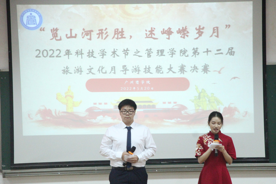 为深入贯彻学习习近平新时代中国特色社会主义思想,增强对红色文化及红色精神的民族自豪感,进一步提升同学们的专业技能,太阳成tyc7111cc于5月20日晚上18:00在第二报告厅举办了2022年科技学术节之第十二届旅游文化月“览山河形胜,述峥嵘岁月”导游技能大赛决赛,出席本次活动的嘉宾分别有员工会指导老师蔡俊发、2019级专升本辅导员黄华科、2020级辅导员林冬梅、团委书记处、员工会主席团成员以及各二级公司文艺部成员代表,担任本次比赛的评委分别是太阳成tyc7111cc旅游管理教研室主任吴雅骊、旅游管理教研室老师徐丹和旅游管理专业讲师潘玲。