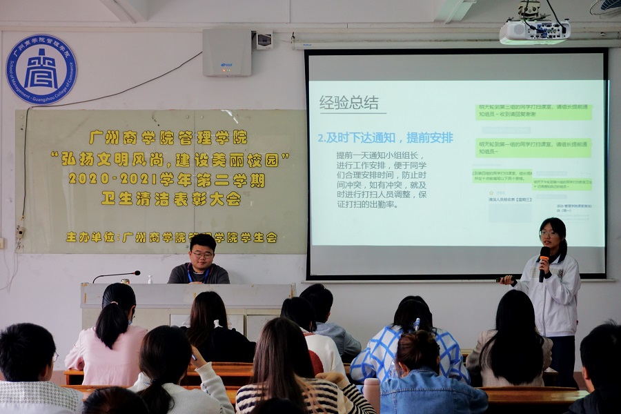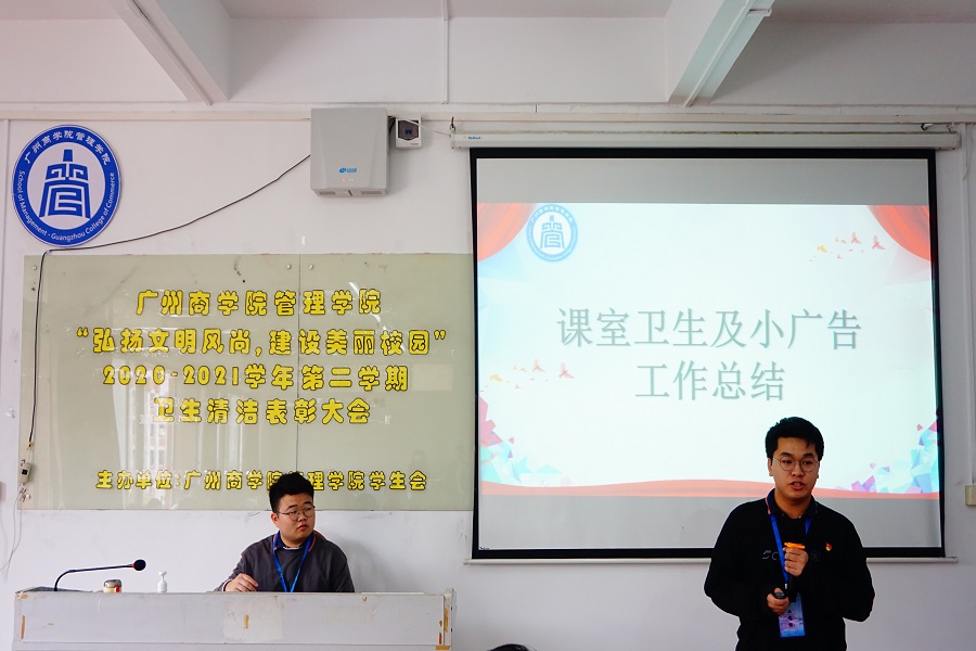 会议伊始,权益服务部部长吴朝伟对2020-2021学年第二学期的卫生清洁工作进行了总结。他表示,在上一学期的卫生清洁工作中,各班根据公司的部署与安排,认真开展各班级的卫生管理工作,调动了班级成员的劳动积极性,为建设美丽校园提供了有力的支持。在颁奖环节中,莫舒雅等5人获优秀生活委员奖。李瑞等3人获优秀员工干部奖,张琦等4人获优秀固定志愿者奖。电子商务2001班等6个班获得优秀班级奖,其中物流管理2003班获得一等奖;物流管理2001班、电子商务2004班、市场营销2003班获得二等奖;市场营销2001班等5个班级获得三等奖。