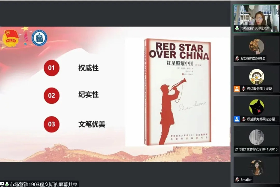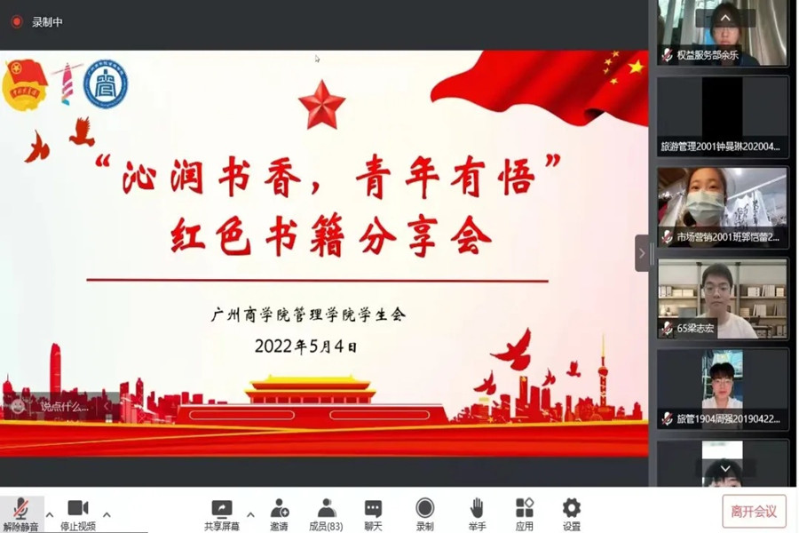 在分享会环节中,由程文斯、杨婉琳、梁志宏、周强、温兆宇五位分享者依次进行了心得分享,分别围绕《红星照耀中国》、《习近平与老员工朋友们》、《四世同堂》以及《毛泽东选集》进行了精彩的讲述,且结合了“五四精神”说出自身感想。让同学们深刻感受了党在这一百年走过的不平凡的道路,感受了无数革命先烈和伟人不畏艰险,攻坚克难的信念和勇气,更使同学们认识到今天幸福生活的来之不易。同时,更加坚定了新一代青年永远跟党走、为国做贡献的决心。在互动环节,观众踊跃参加,分享自身对书籍内容更加深入的理解,引起共鸣。