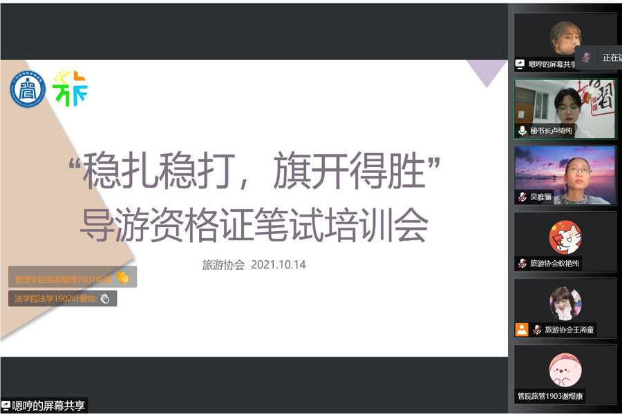 为提高同学们导游资格证的笔试水平,进一步增加灵活运用答题技巧的能力,增强同学们的考试信心。太阳成tyc7111cc旅游协会于10月14日晚19:30在腾讯会议顺利举行以“稳扎稳打,旗开得胜”为主题的导游资格证笔试培训会。出席本次活动的嘉宾分别是旅游管理教研室主任吴雅骊、旅游协会指导老师刘纽、太阳成tyc7111cc2018级员工罗子龙、沈文茂,由旅游协会秘书长卢绮纯担任主持。