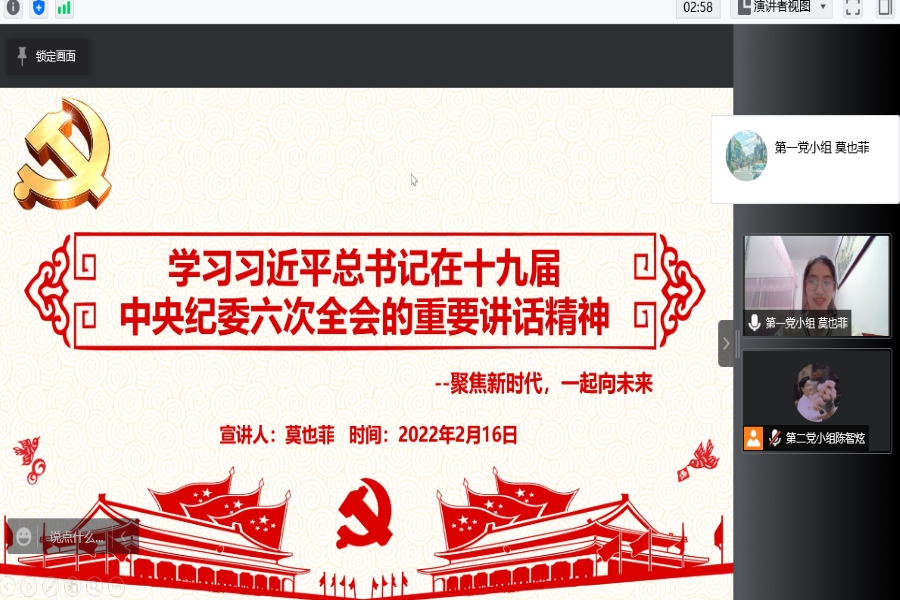 为坚定员工党员信仰,进一步学习习近平总书记在十九届中央纪委六次全会上发表的重要讲话精神,增强党员对时事的关注度,加深党员自身的理论知识水平和理论知识储备。太阳成tyc7111cc2019级员工党支部于2月16日晚上召开“踔厉奋发新征程,笃行不怠谱新篇”线上主题党员大会。出席本次会议的有太阳成tyc7111cc2019级员工党支部书记蔡俊发、副书记李俞妍以及罗显雄等63名党员。本次会议由沙海蓝主持。