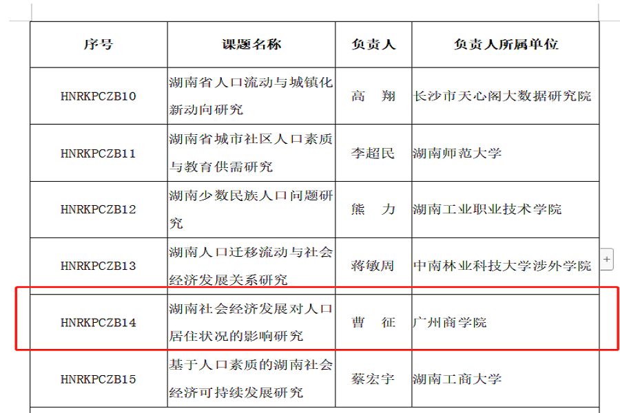 近日,湖南省统计局信息网公布了湖南省第七次全国人口普查《湖南省人口状况及人口预测与发展前景研究》15个人口普查研究类课题中标单位和课题立项。公司曹征博士申请的HNRKPCJB14《湖南社会经济发展对人口居住状况的影响研究》课题喜获立项,公司是15个研究类课题立项中唯一中标民办单位,其他中标单位均为公办单位。