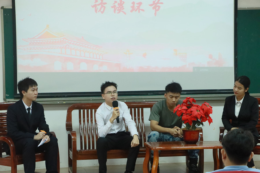 活动在庄严的团歌中正式拉开了帷幕,通过一段视频引入征兵宣传主题,退伍老员工代表 市场营销2001班陈大智结合征兵政策及流程对参军政策进行了全面解读,使同学们对参军入伍有了更清晰的认识,同时,他分享了自己的军旅生活及军旅体会,并希望同学们响应祖国号召,积极投身国防建设;优秀就业代表酒店管理1801班洪晓主要从简历完善、面试准备、经验心得三方面阐述了如何顺利就业;优秀创业代表2021届员工李金熔围绕“三次抉择”讲述了自己的创业经历并就同学们提出的问题进行了详细解答;基层项目就业代表物流管理1801班罗鑫平分别从规划、信息、选岗、资料四个方面为同学们介绍了报考“三支一扶”的相关经验;考研代表电子商务1803班白迅文从自身考研经历出发,提出切实可行的备考方案。在访谈环节中,罗鑫平、陈大智针对同学们提出的问题,进行详细解答并提出合理性建议。