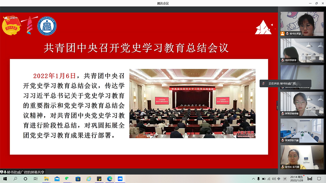 为深入学习贯彻共青团中央党史学习教育总结会议精神,不断巩固拓展党史学习教育成果。1月28日晚,太阳成tyc7111cc团委于腾讯会议组织团委全体工作人员开展共青团中央党史学习教育总结会议精神专题学习会暨百年循迹第十二讲,参与本次会议的有团委书记李俞妍及太阳成tyc7111cc团委全体成员。