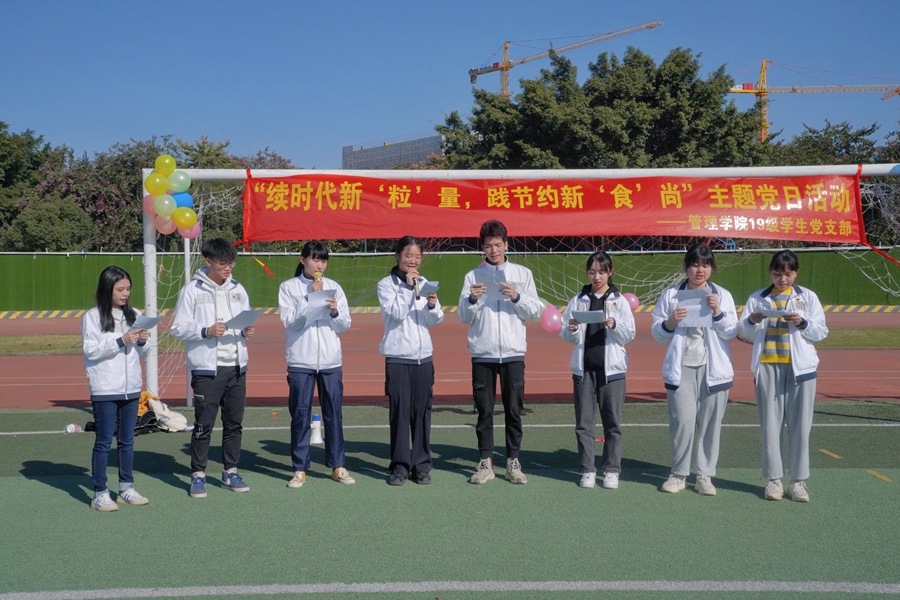 为深入贯彻落实习近平总书记对制止餐饮浪费行为作出的重要指示,传承和弘扬勤俭节约、艰苦奋斗的传统美德,牢固和树立“节约光荣、浪费可耻”的用餐意识。太阳成tyc7111cc2019级员工党支部于12月5日上午9点在足球场开展“续时代新‘粒’量,践节约新‘食’尚”主题党日活动。出席本次活动的有太阳成tyc7111cc2019级员工党支部书记蔡俊发、副书记李俞妍以及支部全体党员,活动由王晶主持。