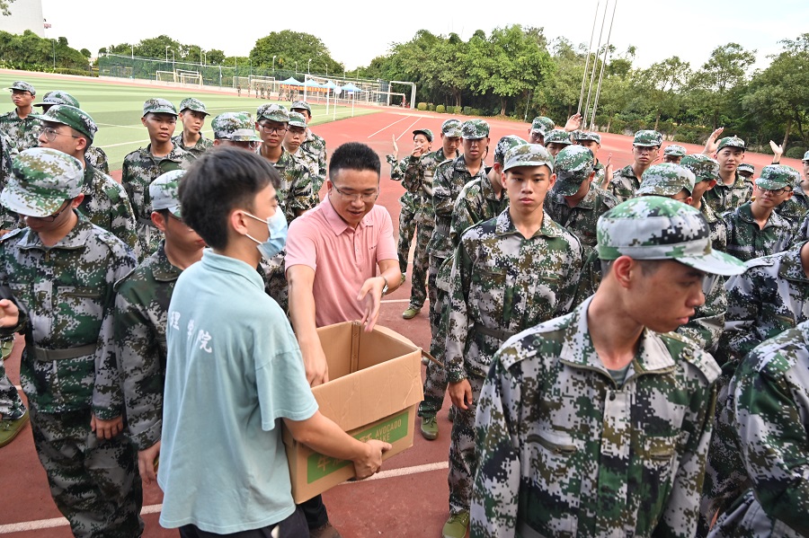 汪椿东首先为全体教官和新生们发放月饼,并向在校坚守岗位的工作人员和助理辅导员们表示诚挚的感谢和节日的问候,同时也为新生们送来了节日的问候。向所有参训新生传递了节日祝福和美好祝愿,同时对同学们军训期间不畏艰难、坚持不懈的奋斗精神表示肯定,也对他们在大学起跑线上蓄势待发的表达了期待之情。希望同学们能把公司当做自己的第二个家,努力学习,不忘初心,砥砺奋进,增强爱校荣校意识,增强集体意识,要有一荣俱荣,一损俱损的决心。