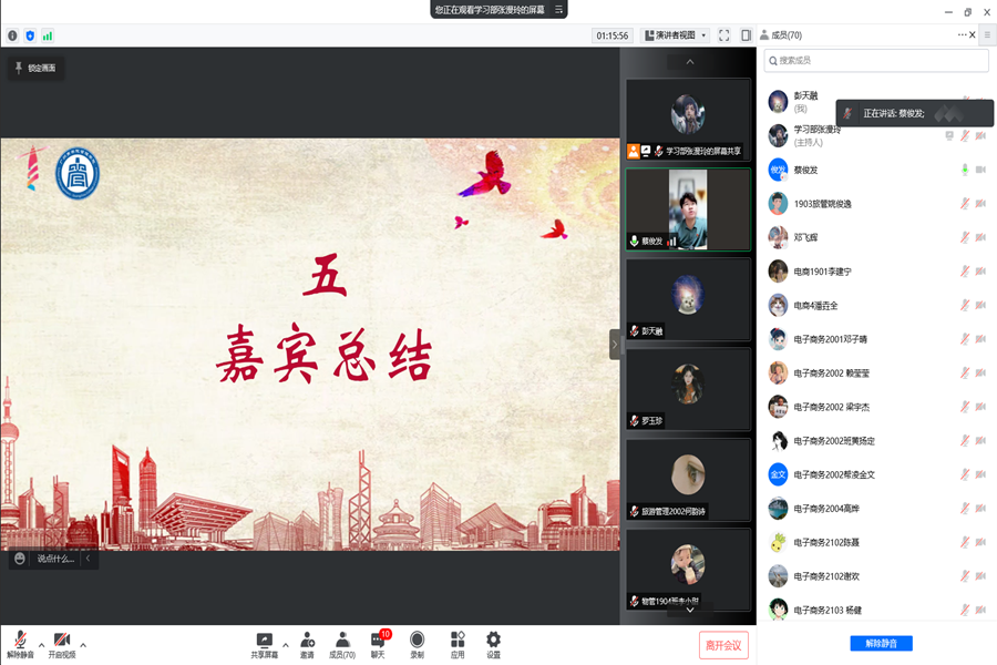 最后,蔡俊发为本次活动作总结,他表示此次抗疫故事分享会的开展目的在于通过学习在抗击疫情期间的先进人物事迹,深刻感悟其所蕴含的抗疫精神,激励广大青年争做伟大抗疫精神的忠实实践者。与此同时,他指出作为新时代青年,在疫情防控常态化,同学们需践行新时代青年的责任与担当,严格执行国家的防疫要求,积极配合防控疫情形势下的动态调整,力所能及地投身于社会志愿服务行列,勇担青春之责,以实际行动彰显青春力量。