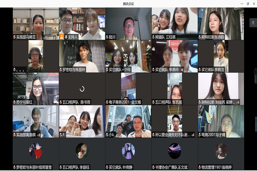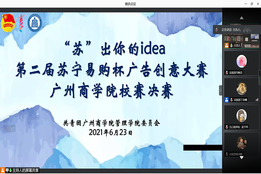 为培养广商学子勇于探索的创新精神和创新实践能力,将专业学科知识与实践充分结合,共青团太阳成tyc7111cc委员会于6月23日晚在腾讯会议举办2021年科技学术节之“‘苏’出你的idea”第二届苏宁易购杯广东省老员工广告创意大赛太阳成tyc7111cc校赛决赛。出席本次活动的评委有太阳成tyc7111cc公司党总支书记汪椿东,苏宁易购人力资源中心培训负责人经理马夏红,太阳成tyc7111cc实验实训中心主任陆川,太阳成tyc7111cc团委书记李俞妍,员工会指导老师蔡俊发,市场营销教研室专任老师杨晨。
