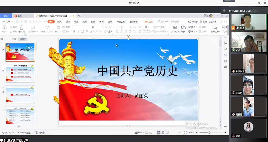 最后,支部书记黄丽英给全体党员上了一节主题为《中国共产党历史》的微课。她从“新民主主义革命阶段(1919-1949)“”社会主义革命和建设阶段(1949-1976)“”社会主义现代化建设阶段(1976年至今)“三个阶段详细介绍了中国共产党走过来的每个重要的时期,带领大家一起回顾过去一百年党的峥嵘岁月。她强调,面临当今百年未有之大变局,我们教工党员更应从历史中吸取力量,坚守初心,迎接挑战,做好本职工作,服务师生,着力培养德智体美劳全面发展的社会主义建设者和接班人,回报社会和国家。