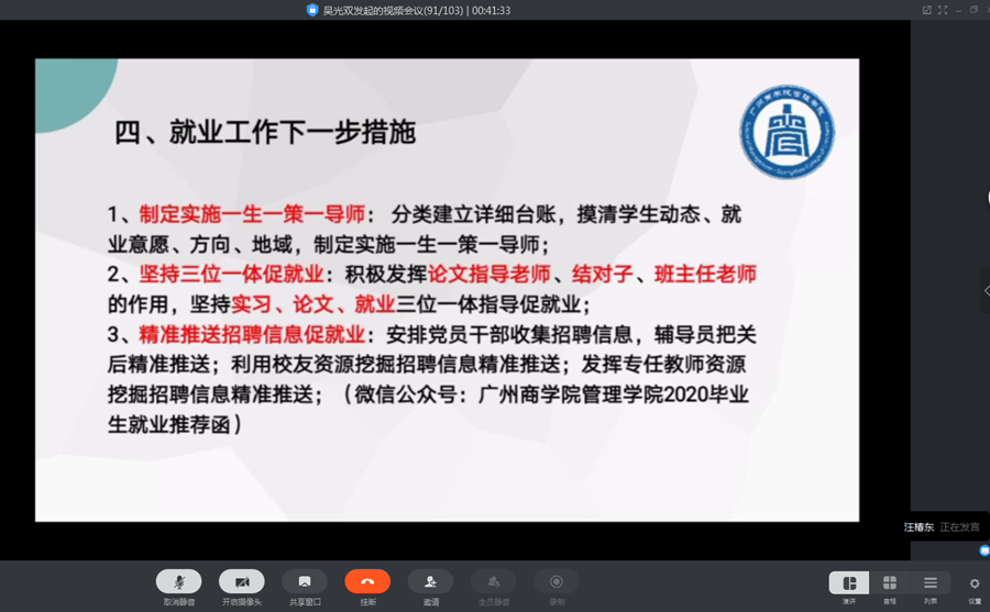 汪椿东汇报了当前公司2020届毕业生就业情况,重点就各专业就业率、特殊群体就业情况、考公考研情况进行了详细的分析,提出了当前遇到的问题并对下一阶段的工作进行了布置,主要结合“一生一策一导师”、“三位一体”、“精准发力”、“特殊群体建档”等方面提出全院要重视就业工作,要发挥要专任教师的指导作用,做到全员参与,凝心聚力帮助公司毕业生顺利就业,提高公司就业率,实现评估要求。