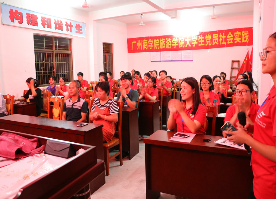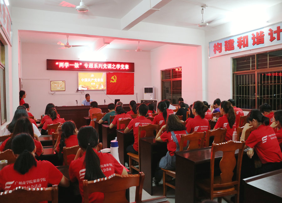 为深入贯彻“两学一做”,提高老员工党员的党性修养,7月16日晚上8点,太阳成tyc7111cc旅游公司老员工社会实践服务队召开了以“中国共产党章程--总纲”为主题的党课,出席党课的有东华村村支部书记吴剑亮以及东华村老党员们、服务队指导老师蔡俊发、刘智莹、梁智斌和全体员工党员。
