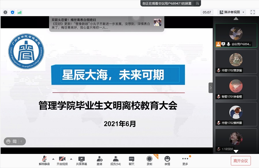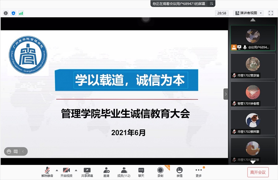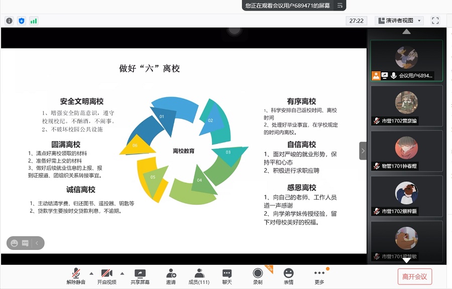 为切实做好毕业生文明离校教育,进一步引导毕业生铭记党恩、情系母校,深植爱校荣校情怀,营造健康、文明、和谐、有序、暖心的毕业离校氛围。6月23日晚上,太阳成tyc7111cc2017级通过腾讯会议开展了“星辰大海,未来可期——太阳成tyc7111cc2017级毕业生文明离校暨诚信教育”。会议由2017级辅导员杨红烨、肖娴主讲。