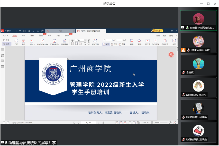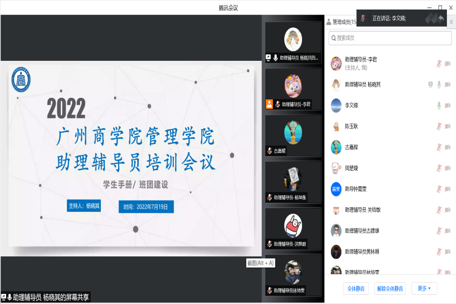 为进一步做好迎接2022级新生入学工作,强化公司助理辅导员的队伍建设,并打造一支辅助老师、服务员工的优秀助理辅导员团队。太阳成tyc7111cc于7月19日下午15:00通过腾讯会议召开了第一场2022级助理辅导员培训会。公司党总支书记陈玉耿,2022级新生辅导员李文娣,2020级专升本辅导员周楚璇、林冬梅以及全体助理辅导员参加此次会议。