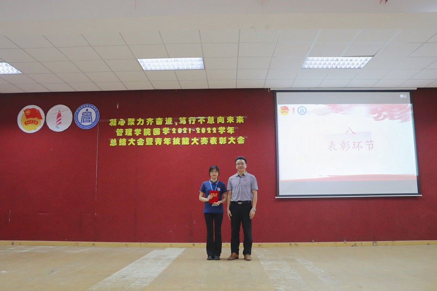 各部门紧密围绕学年工作开展情况、存在不足、改进方法及未来展望等方面进行述职汇报答辩,在积极探索新方法、新思路中不断优化部门工作机制,为后续工作开展夯实基础、拓展新思路;20级电子商务三团支部进行青年技能大赛班团赛道汇报,围绕团支部建设、班团支部特色风采,对本学年工作进行总结与反思。结合个人笔试考核、宣讲考核及部门考核制度,团委秘书处、组织部、员工会权益服务部、宣传部获得优秀部门称号,20级电子商务三团支委获得优秀团支委称号,沈文婕、戴依莹、冯卓辉、郭世杰、邹家栋、钟思燕获得优秀个人称号,嘉宾为获奖集体和获奖个人进行颁奖。