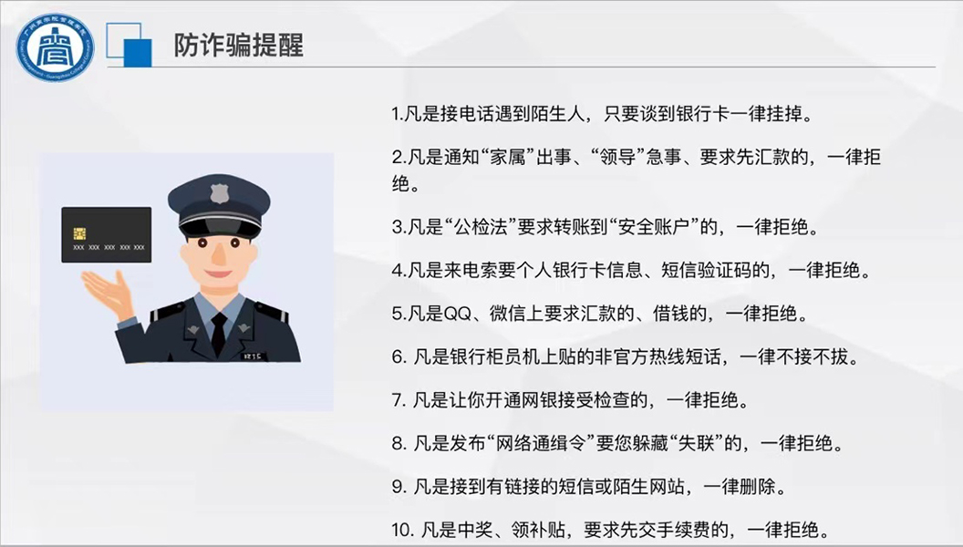 会议就公司开学返校相关流程及注意事项进行了部署,重点讲解了返校时间、返校条件,并强调有关返校前的准备工作,提醒同学们连续14天做好健康监测;备好健康码、行程码及48小时内的核酸检测报告。同时,对返校途中与返校后各类安全知识进行了再讲解,重点讲解现代诈骗的标志性骗术等防诈骗知识以及出行安全、网络安全、人身财务安全等安全知识,旨在提高员工的防诈骗意识,引导员工将安全意识融入日常生活,共同筑牢校园安全防线,营造安全稳定的校园环境。