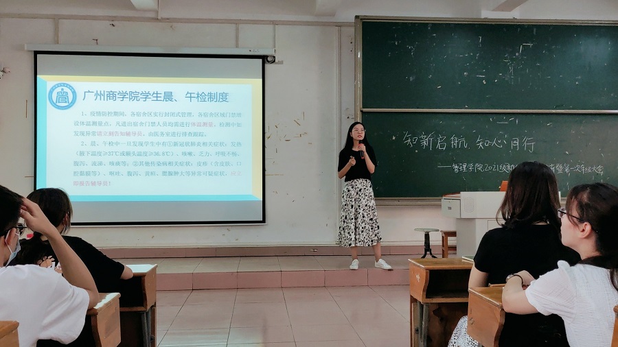 肖娴主要从新生的环境适应、学习适应、生活适应、心理适应等方面入手,帮助新生了解公司及公司概况,详细介绍了大学的学习生活、目前公司的防疫制度、学分制度、大学规划等方面,同时通过介绍历届优秀学子的获奖情况来激励同学们努力学习。最后希望同学们可以配合公司安全管理、规范自己的行为准则、加强自身的思想道德教育。寄语同学们真正的自由是在所有时候都能控制自己,希望各位同学们可以在大一做好人生规划,做到自信、自律、自强。