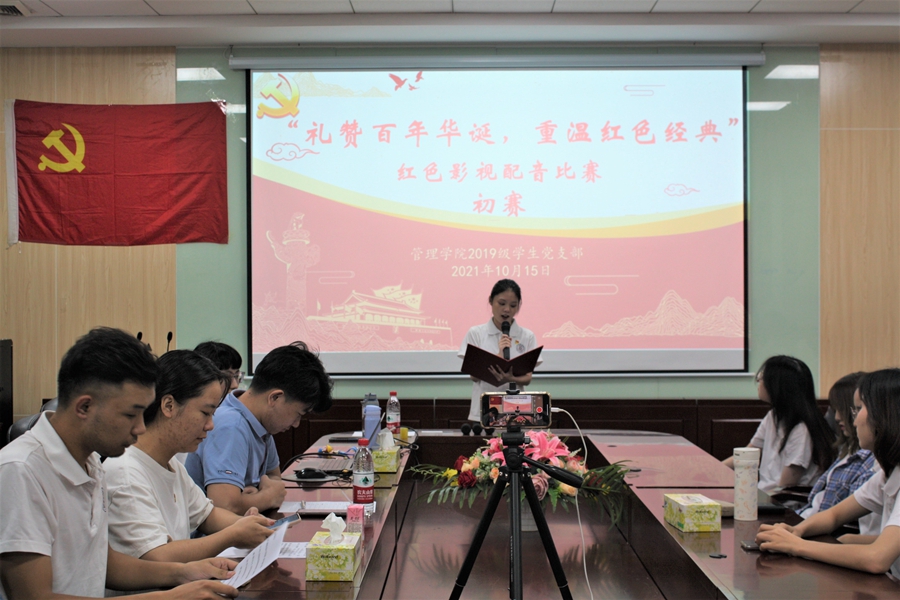 为热烈庆祝中国共产党成立100周年,充分发挥红色资源在党史学习教育中的重要作用,让广大青年感受红色精神,加深新时代老员工对红色文化的理解,进一步激发同学们爱党爱国的热情。太阳成tyc7111cc19级员工党支部于2021年10月15日在第二行政楼308开展“礼赞百年华诞,重温红色经典”红色影视配音初赛。出席本次活动的评委有太阳成tyc7111cc19级员工党支部书记蔡俊发。