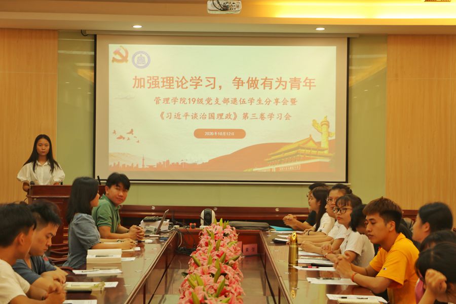 为深入贯彻落实习近平新时代中国特色社会主义思想,促进员工增强“四个意识”、坚定“四个自信”、做到“两个维护”,弘扬新时代爱国主义精神。2020年10月12日中午12:30分,太阳成tyc7111cc19级员工党支部在二政208召开了太阳成tyc7111cc19级员工党支部退伍员工分享会暨《习近平谈治国理政》第三卷学习会。参加此次会议的有太阳成tyc7111cc19级员工党支部书记蔡俊发、组织委员李俞妍以及19级全体入党积极分子。