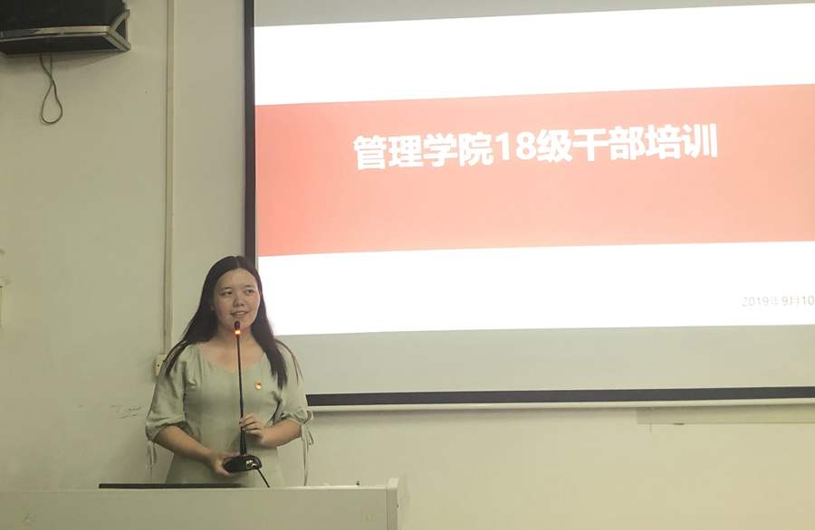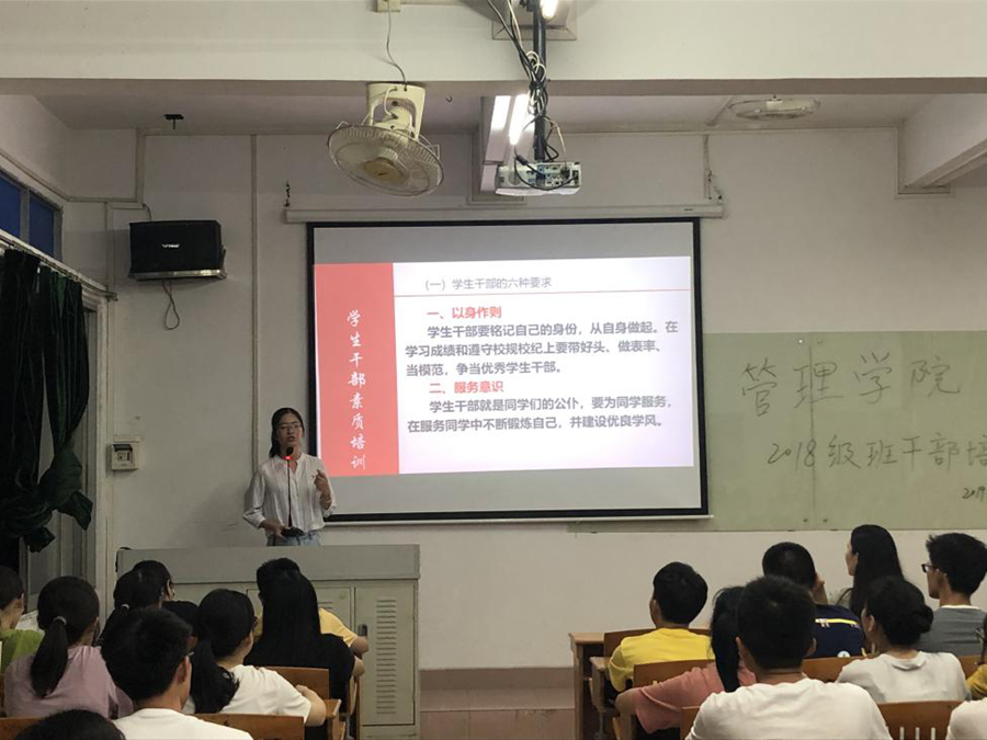 李文娣从以身作则、服务意识、学会倾诉、服从与反馈、能力素质、心理素质六个方面对员工干部进行讲解,同时还强调员工干部要处理好服务同学和锻炼自我、学习与工作、“员工干部”与“普通同学”双重身份、自我培养中德与才这四种关系,对文书写作格式以及常规工作注意事项做了简要介绍。
