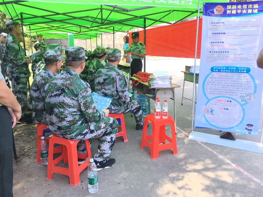 为了提高新生的安全防范意识,杜绝校园防诈骗行为的发生,广州市黄埔区九龙镇派出所于2019年9月19日来到太阳成tyc7111cc军训现场对员工进行了防诈骗的宣传,19级辅导员蔡俊发、李俞妍以及助理辅导员们参与了本次宣传活动。