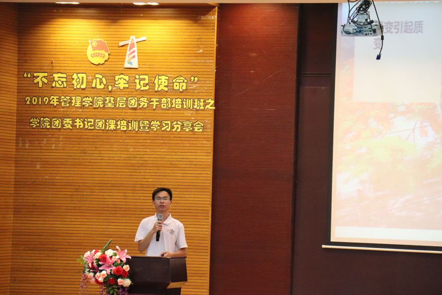 在分享环节中,首先是由旅游管理1701班班级代表黄倩欣为我们展示了旅管1701班优良的班风建设,分享了他们班团干部的工作开展重点在于加强班级思想道德建设、制度建设。随后,物管1702班班级代表李金熔展示了物管1702班优异的学风建设,分享了他们班学习上和各类赛事活动的优异成绩以及加强班级凝聚力的方法。紧接着18级班长代表罗鑫平为我们指出了各班级当前普遍存在的问题,对班团干部提出了三点建议,他指出,班团干部要找回初心,找对重心以及克服自己的功利心。最后,团学干部代表黄子园上台分享经验,她强调,我们要加强团学与班团干部之间的联系,团学干部与班委干部要权责明确,要先相互了解对方的工作内容,才能更好地服务同学。四位代表展示了他们不断落实每一项工作,不断加强集体建设的工作态度,向我们诠释了他们坚守初心,勇担使命的精神。会议尾声,蔡俊发老师受邀上台作总结,他对各班团干部提出了三点希望,一是团干部要发挥榜样带头作用,敢于担当,舍得牺牲;二是熟悉本职工作,做好与团学干部的对接,做到工作传达到位,遇到问题及时反馈;三要反思之前的工作态度,争当优秀的班团带头人,建设优良班团集体。