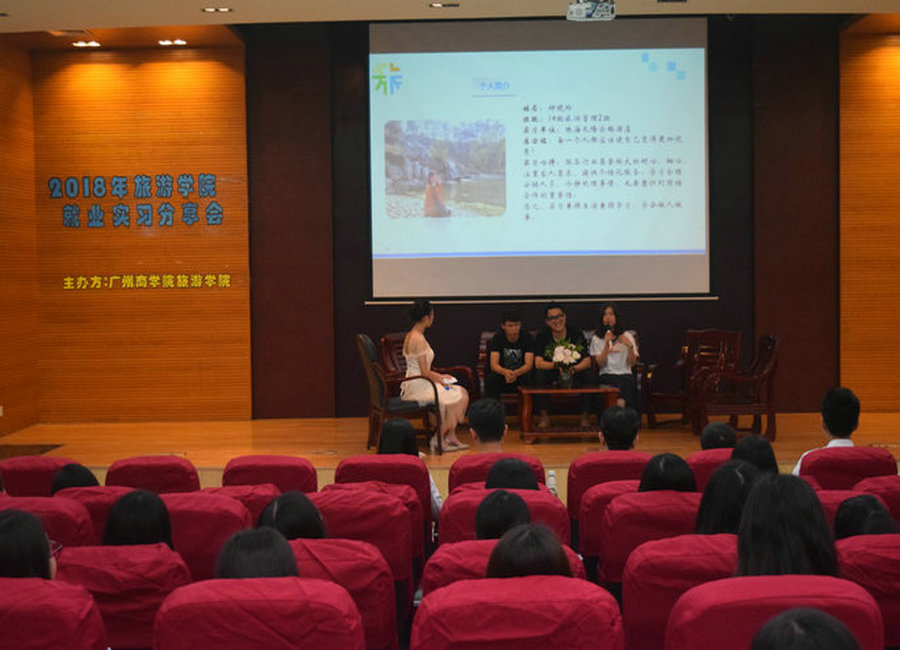 本次分享会邀请到的毕业生代表分别是选择了酒店、旅行社、民宿、出国留学、考研不同的发展方向的比较具有代表性的员工。每位代表首先介绍了他们的主要工作,向大家介绍了工作过程遇到的主要困难。同时,经验分享环节,各位代表和观众分享了工作过程出现的问题,具体到遇到顾客不满和投诉的一些解决方法。代表们一致强调工作实习时要学会为人处事,要做才德兼备的人才能更好的与同事处好关系,从而做好个人工作。自由提问环节,代表们有针对性地给师弟师妹们提出宝贵建议,使在座的各位同学收获良多,受益匪浅。