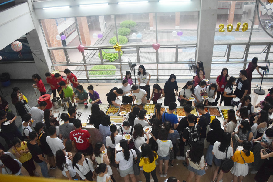 冷餐会以经理与毕业代表一起切蛋糕拉开序幕,每一层蛋糕都象征着对2018届毕业生最美好的祝福,也希望每位毕业生以后的生活像这蛋糕一样,甜甜美美。随后,全院师生一起共享美食盛宴,用餐完毕后,大家前往206教室参加以“落萚成竹,梦拥仲夏”为主题的2018届毕业生晚会。