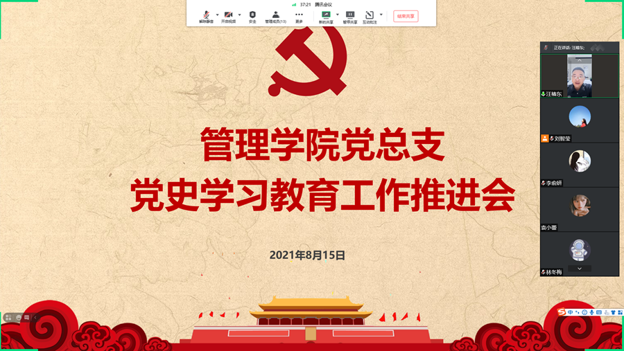 为深入学习贯彻习近平总书记在庆祝中国共产党成立100周年大会上的重要讲话精神,扎实推进党史学习教育工作,引导党员切实增强“四个意识”、坚定“四个自信”、做到“两个维护”,做到党史学习教育暑期不断线,8月15日晚上,公司党总支在“腾讯会议”App召开暑期党史学习教育工作推进会议,公司党总支书记汪椿东参加并主持会议,各支部书记及支委参加会议。