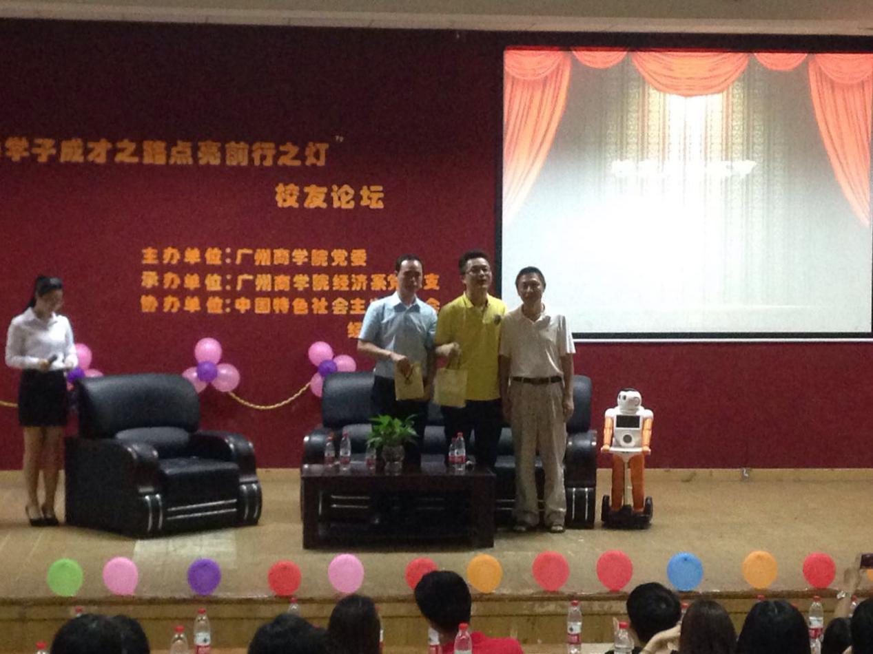 另外一位访谈对象是2006届毕业的优秀毕业生陈万丙师兄,他先后创立了佛山市蓝帆卫浴有限公司、广东省米欧机器人有限公司、广州米欧电子科技有限公司(子公司),陈师兄特地带来了其公司开发的机器人“旺仔”,当工作人员将它搬到台上时,一句“我要摔倒了,好尴尬吖”的话语让员工们开怀大笑,一支“最炫民族风”的舞蹈也给在场的观众留下了深刻印象,将现场气氛推向高潮,人机互动也让同学们见识了机器人领域高科技的产品。精彩过后,陈师兄向学子们分享了个人经历及心得:“思维、敬业精神和共同的价值追求对一个团队来说至关重要”, 随着社会的发展,年轻人的浮躁也越也越显现出来,通常表现为缺乏敬业精神和对学习的热情,在做事的过程中没有很好的培养及践行好自己的价值观,同时希望学子们在珍惜在校的时光,修改自身的缺点。之后陈师兄提出他愿意为广商学子提供实习机会的承诺,给予有创业想法但是又很迷惘的学子们一些帮助,希望学子们可以不断学习,提高思维能力,勇于做自己想做的事情,追求自己的理想。